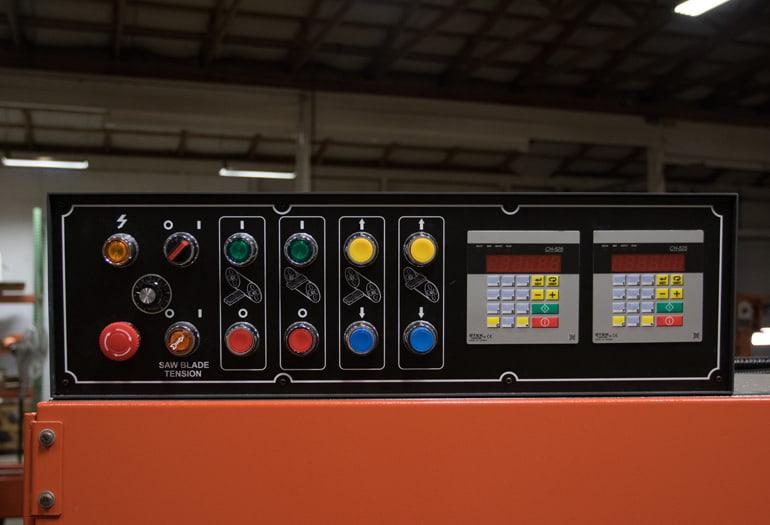 Automatický systém napínání pilového pásu udržuje během řezného procesu správné napnutí pásu pro jeho delší životnost a okamžitě stroj zastaví pokud se pás přetrhne, tím zajistí, že nevznikne žádné další poškození vnitřku a dřeva.