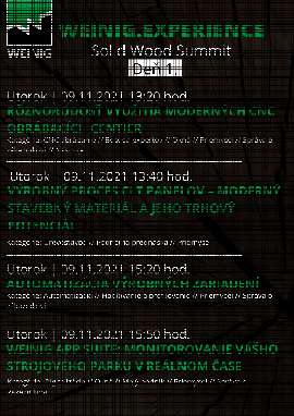 9. – 11. novembra je pre Vás pripravený bohatý program prednášok, diskusií, ukážok priamo od strojov, rozhovorov s expertami WEINIG ale aj ďalších externých expertov z rôznych univerzít či spolku VDMA.