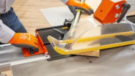Jedním z nejužitečnějších příslušenství pro pilu MS300 je upínání k rychlému zablokování materiálu přímo k posuvnému stolu, aby se předešlo náhodnému pohybu materiálu.